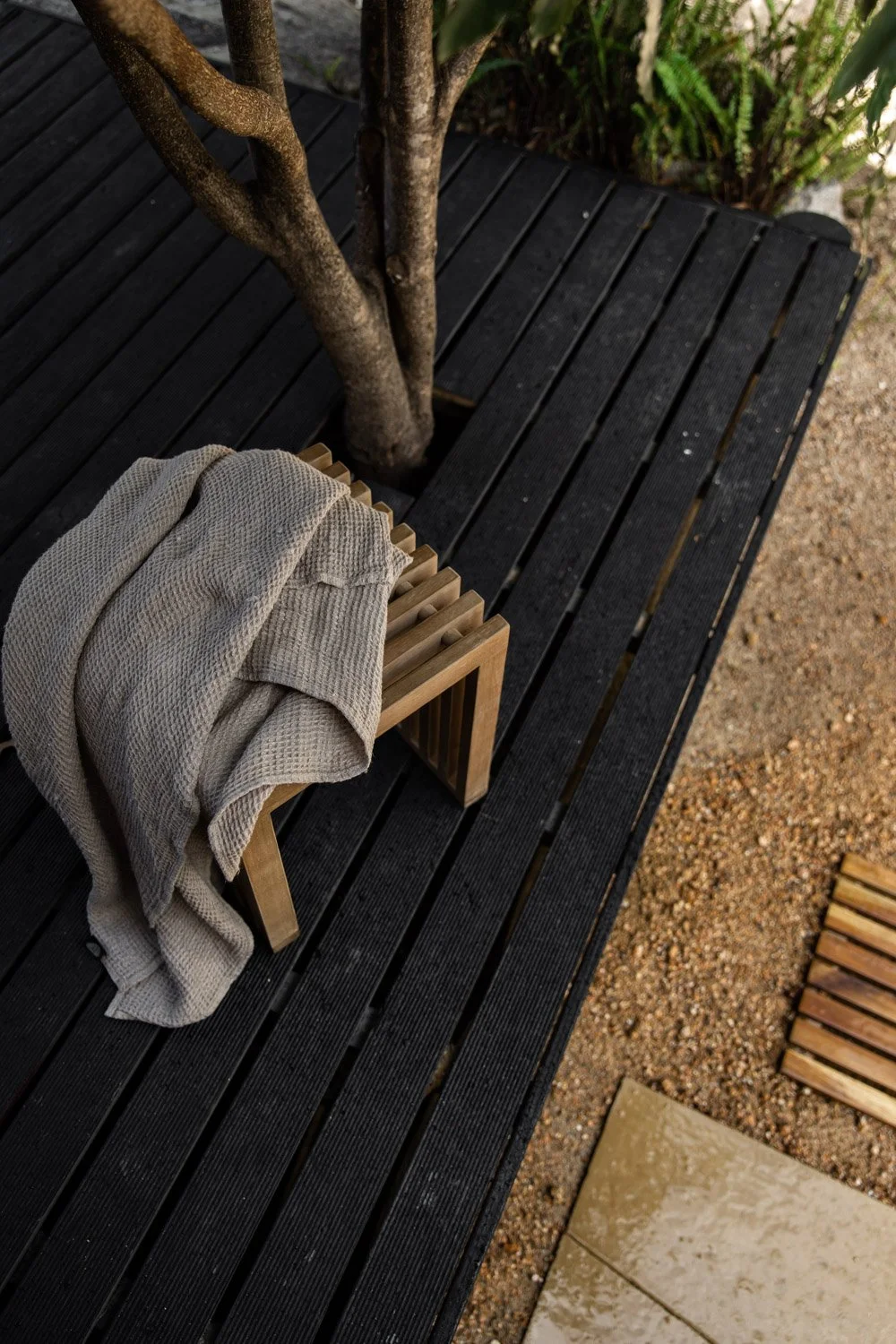 The handmade table and stools were crafted from reclaimed Tasmanian Oak. Rich in texture and weathered by time, these pieces were crafted for SABI by local artisans.